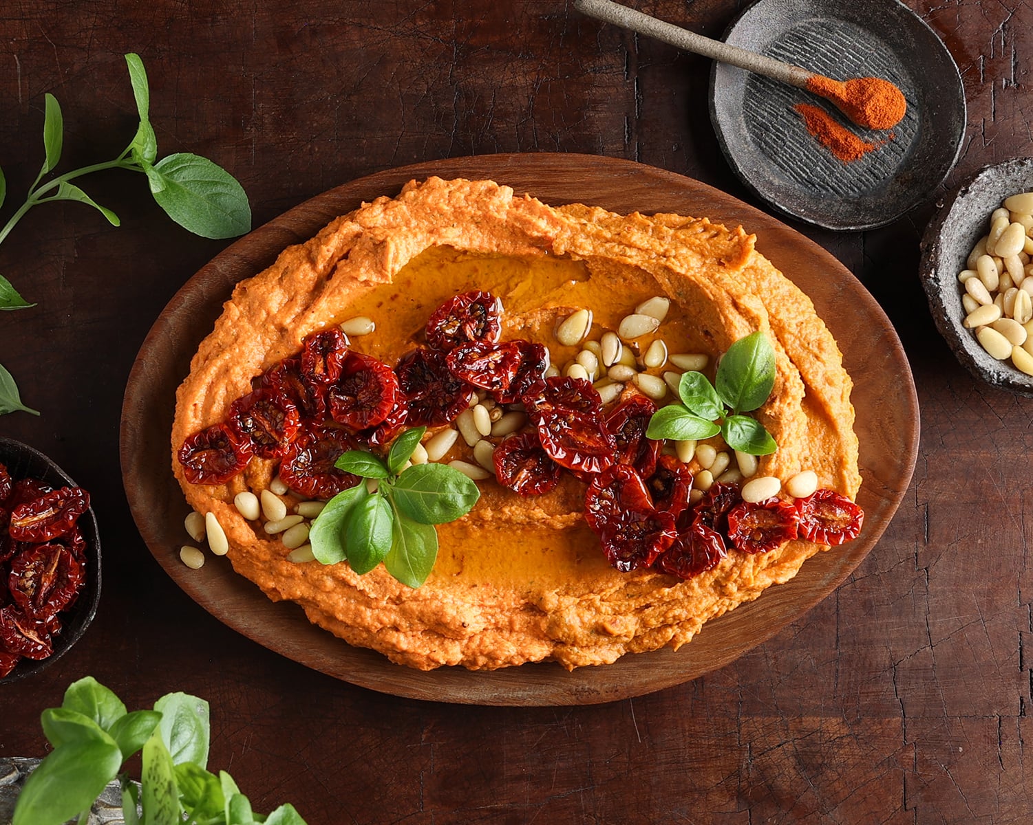 - Adjust and Finish: Taste and adjust with more lemon juice, salt, or a splash of reserved aquafaba to loosen if needed. Blend one final time until dreamy.Pinch smoked paprika, Extra virgin olive oil, Sun dried tomatoes, Fresh Basil leaves, Pine nuts